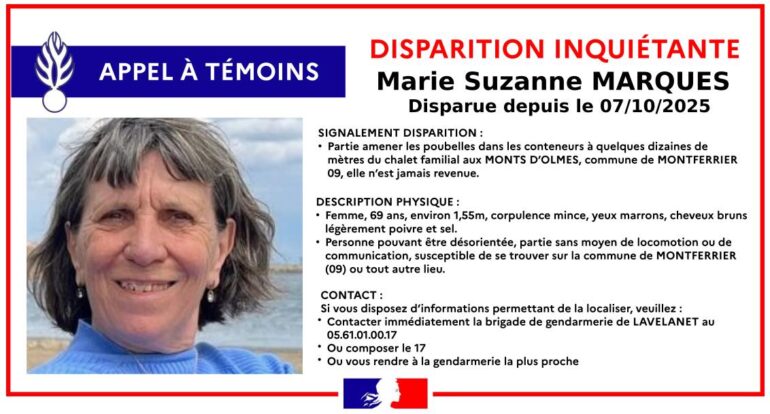 Six mois après sa disparition, Marie Suzanne Marques reste introuvable. Le 7 octobre 2025, elle est partie déposer les poubelles dans les conteneurs à quelques dizaines de mètres du chalet familial aux Monts d’Olmes sur la commune de Montferrier (Ariège). Elle n’est jamais revenue depuis. Suite à cette disparition inquiétante, la gendarmerie de l’Ariège relance son appel à témoins.
