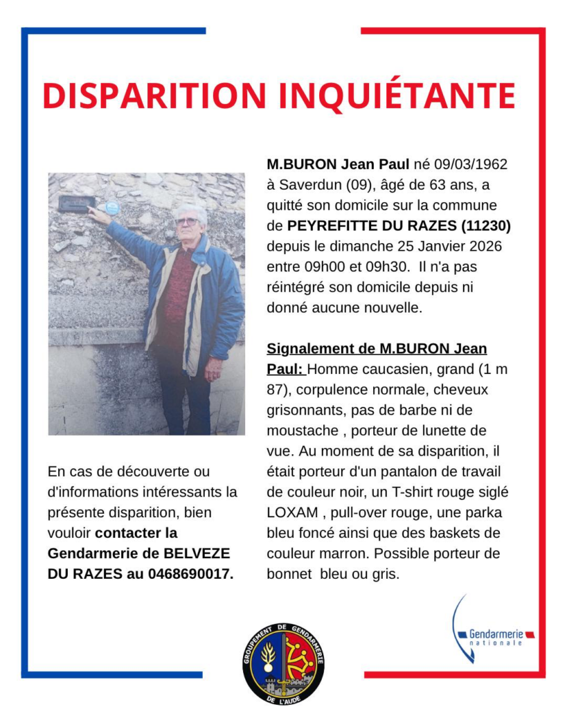 Un avis de disparition inquiétante a été diffusé par la gendarmerie de l’Aude, après la disparition de Jean Paul, 63 ans. L’homme n’a plus donné signe de vie depuis le dimanche 25 janvier 2026, après avoir quitté son domicile de Peyrefitte-du-Razès, dans l’Aude. Il est originaire de Saverdun, en Ariège.