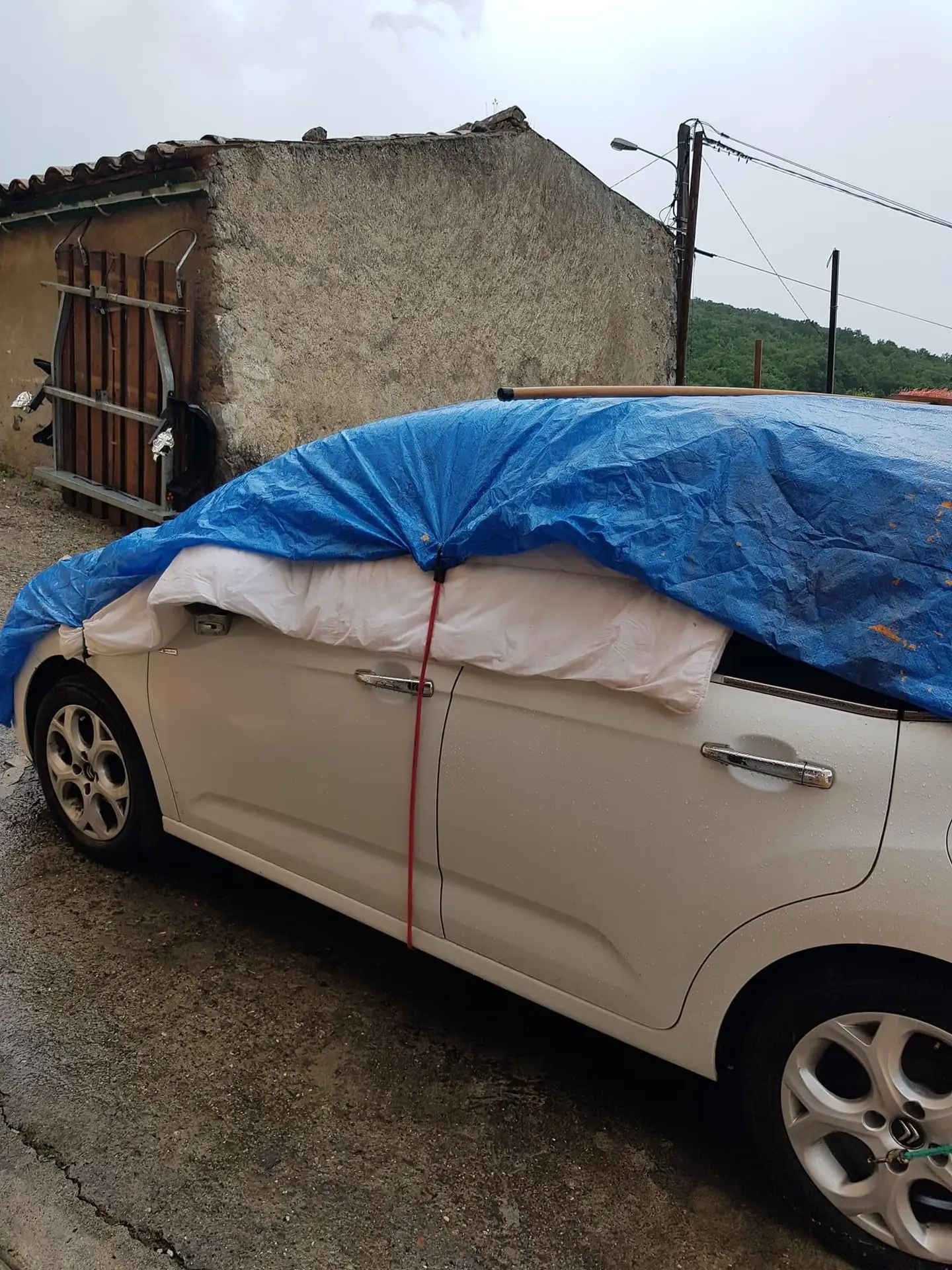 Une habitante de Quilhan dans l’Aude protège sa voiture contre la grêle.