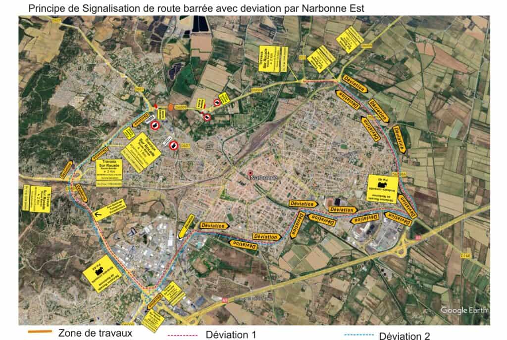 Durant ces travaux, une déviation sera mise en place dans les deux sens par la RD6009A via le centre-ville de Narbonne. L’itinéraire s’effectuera de la sorte : avenue Maître Hubert Mouly – rue Eugène Montel – boulevard de la Mayolle – boulevard de Maraussan – avenue d’Espagne – route de Perpignan – RD6009. Il sera aussi bien adapté aux véhicules légers qu’aux poids lourds. Pour ces derniers, un itinéraire conseillé sera toutefois mis en place entre les deux sorties d’autoroute.