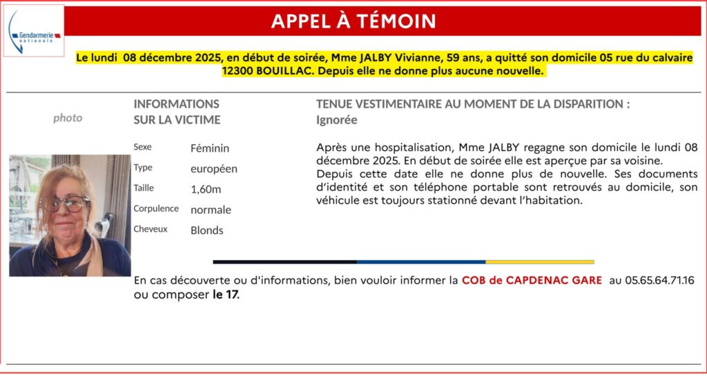 Vivianne Jalby, 59 ans, est portée disparue depuis le lundi 8 décembre. Ce jour-là, après une hospitalisation, elle est rentrée à son domicile situé au 5 rue du Calvaire à Bouillac, mais l’a rapidement quitté et n’a plus donné de nouvelles depuis. Elle a été aperçue en début de soirée par une voisine. Ses documents d’identité et son téléphone portable ont été retrouvés à son domicile, et son véhicule reste toujours stationné devant l’habitation.