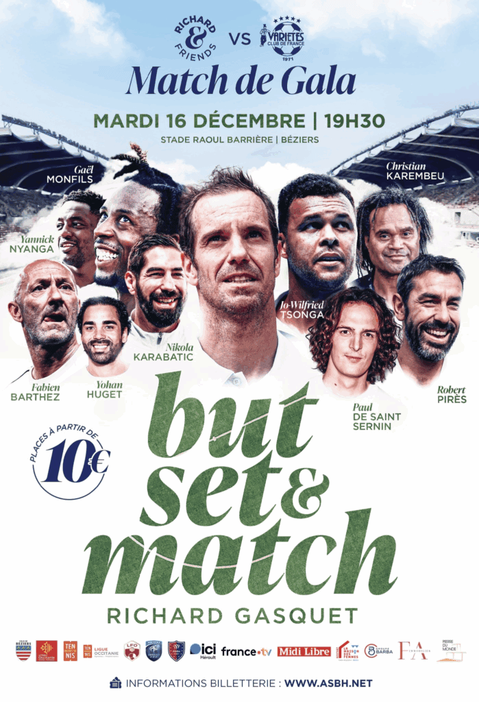 Le 16 décembre 2025, Richard Gasquet vous invite chez lui, à Béziers, pour une fête solidaire et pleine de bonne humeur. Passionné de football, l’ancien numéro 7 mondial vous donne rendez-vous au stade Raoul-Barrière pour un match de gala exceptionnel. La « Team Gasquet & Friends » affrontera le « Variétés Club de France », au profit de l’école du tennis club de Sérignan. Une soirée sportive et conviviale à partager en famille ou entre amis… Mardi 16 décembre – 19h30. Billetterie ici : https://urlr.me/ap8nWB.