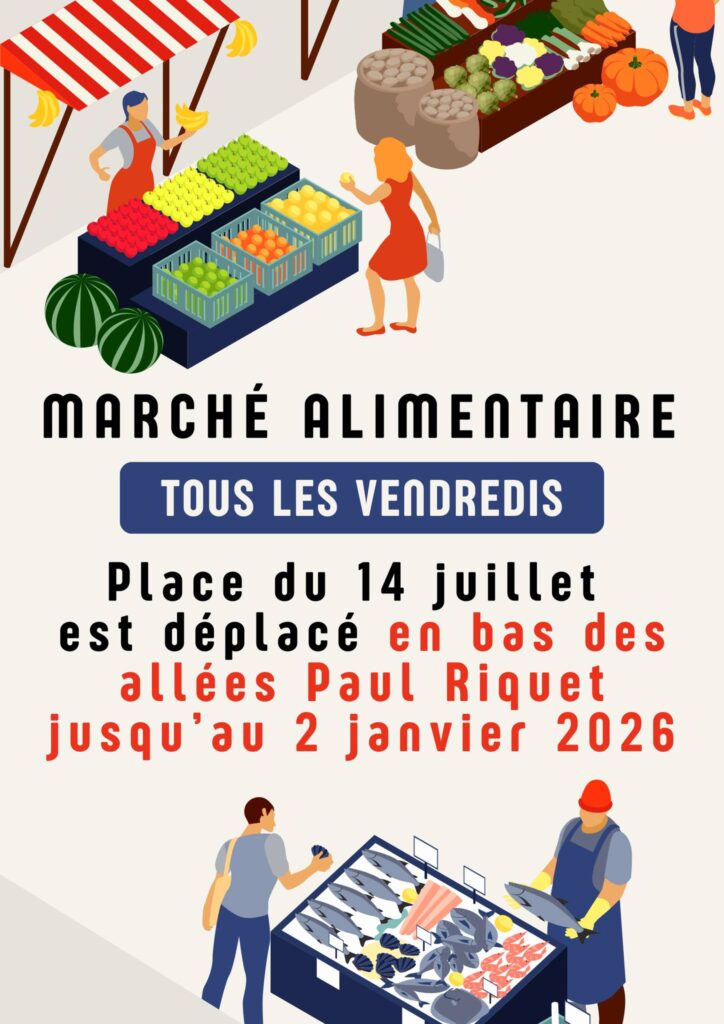 Le marché alimentaire qui se tient chaque vendredi à Béziers change exceptionnellement d’emplacement. En raison de l’installation de la fête foraine, il ne pourra plus se dérouler sur la place du 14 juillet. Désormais, et jusqu’au 2 janvier 2026, les étals seront installés en bas des allées Paul Riquet.