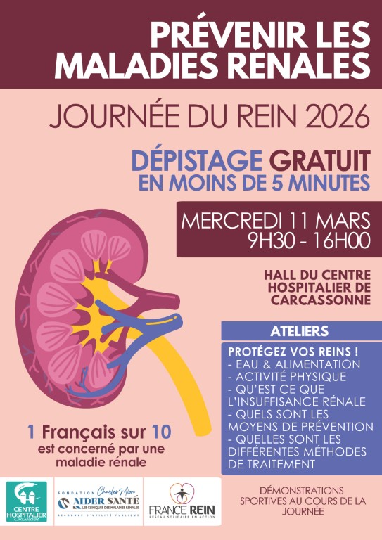 Du 9 au 14 mars 2026 se déroule la semaine nationale de dépistage gratuit des maladies rénales. À Carcassonne, la Ville propose un dépistage ouvert à tous dans le hall du Centre Hospitalier, mercredi 11 mars, de 9h30 à 16h. Rapide et simple, moins de cinq minutes, ce test vise à détecter précocement d’éventuelles maladies rénales. Parallèlement, des ateliers de prévention seront animés au sein de l’établissement pour informer, répondre aux questions et accompagner le public dans les gestes de prévention.