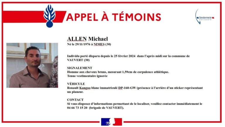 Si vous avez aperçu Michael Allen depuis le 25 février 2024 ou si vous disposez d’informations permettant de le localiser, veuillez contacter la brigade de gendarmerie de Vauvert au 04 66 73 15 20.