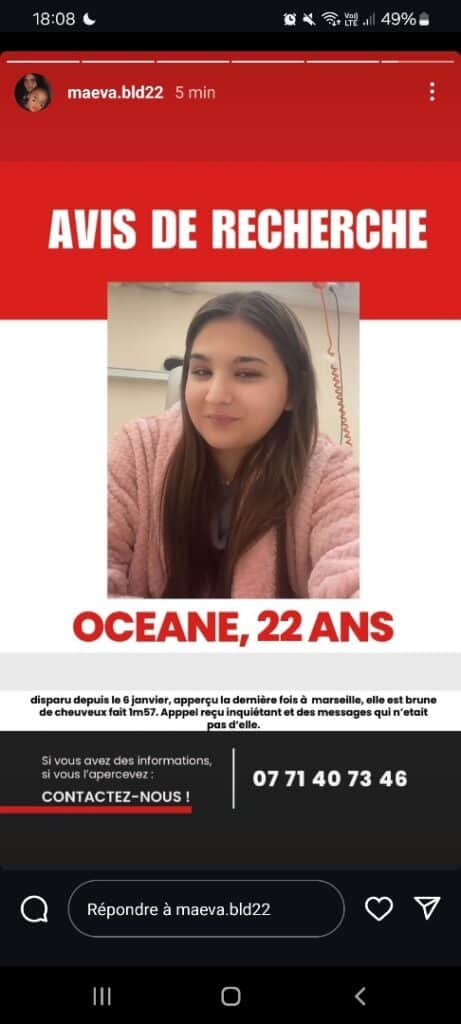 Océane, une femme de 22 ans est portée disparue depuis le 6 janvier dernier. Elle mesure 1m57, les cheveux bruns et a été aperçue la dernière fois à Marseille. Également, sa famille a reçu des appels et messages inquiétants ne venant pas d’elle suggérant sa disparition.