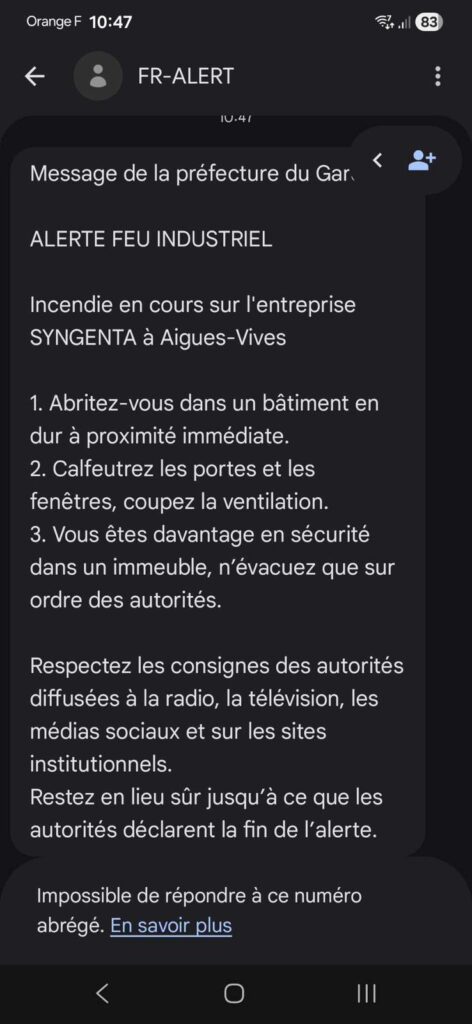 « Alerte feu industriel. Incendie en cours sur l’entreprise Syngenta à Aigues-Vives ». Si vous avez reçu ce message du dispositif FR-ALERT sur votre smartphone ce jeudi 18 décembre matin, pas de panique, il s’agit en réalité d’un exercice. Il est également possible que la population de cette zone entende la sirène d’alerte de l’entreprise. Dans un communiqué, la préfecture du Gard précise que « suite à un incident technique le message ne mentionnait pas le terme EXERCICE EXERCICE EXERCICE ». Et confirme ainsi l’exercice en cours sur le site de l’entreprise.