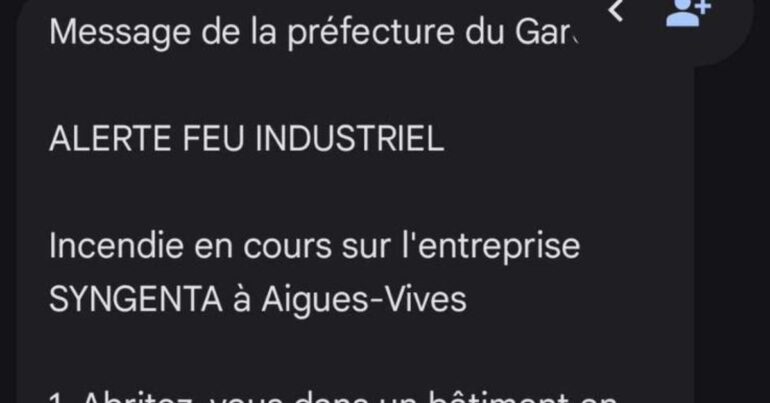 « Alerte feu industriel. Incendie en cours sur l’entreprise Syngenta à Aigues-Vives ». Si vous avez reçu ce message du dispositif FR-ALERT sur votre smartphone ce jeudi 18 décembre matin, pas de panique, il s’agit en réalité d’un exercice. Il est également possible que la population de cette zone entende la sirène d’alerte de l’entreprise. Dans un communiqué, la préfecture du Gard précise que « suite à un incident technique le message ne mentionnait pas le terme EXERCICE EXERCICE EXERCICE ». Et confirme ainsi l’exercice en cours sur le site de l’entreprise.