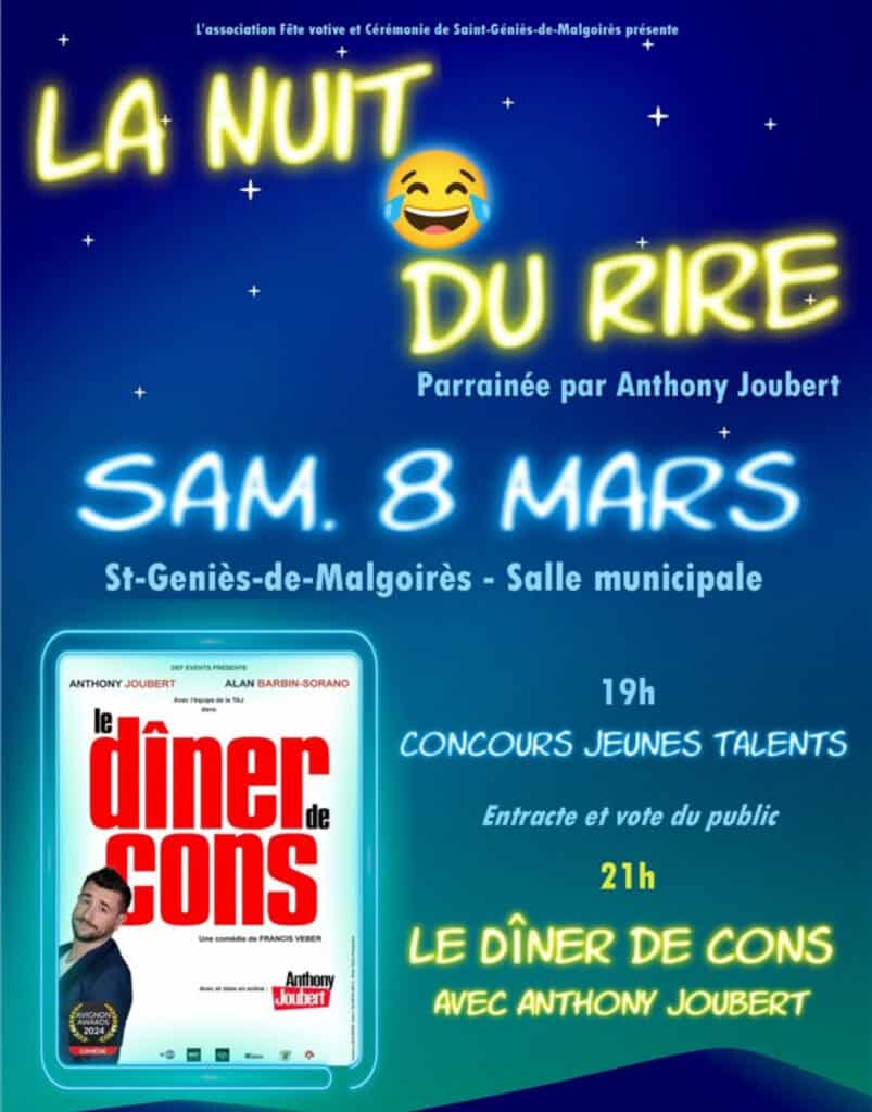 L’humoriste Anthony Joubert sera à Saint-Geniès-de-Malgoirès dans le Gard le samedi 8 mars 2025. À l’occasion de l’événement La Nuit de Rire, organisé par l’association fête votive et cérémonies. A 19h, concours jeunes talents avec vote du public. Après l’entracte, le spectacle Le Dîner de Cons avec Anthony Joubert aura lieu à partir de 21h00.