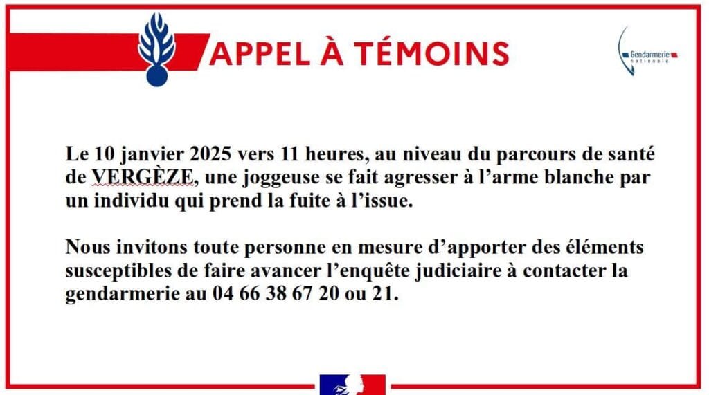 La procureure de la République confirme que le 11 janvier 2024 aux alentours de 11h, qu’alors qu’elle faisait son jogging dans un parc de santé à Vergèze (30), une femme, mère de famille âgée de 44 ans, a fait l’objet d’une agression à l’arme blanche par un individu l’ayant frappée de plusieurs coups par derrière.