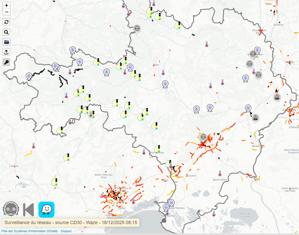D’autre part, la circulation est très compliquée sur le chemin des canaux. Il est recommandé d’éviter ces secteurs. Ci-dessous, la carte de Waze, partenaire du Département.