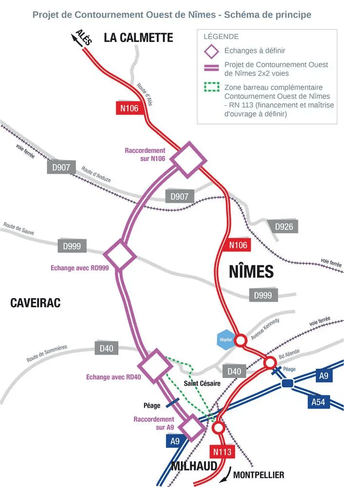 Très attendu, le projet de contournement Ouest de Nîmes (CONIMES) vise à créer une nouvelle route à 2×2 voies reliant la RN106 au nord de Nîmes à l’autoroute A9. Ce projet, d’une longueur de 12 km, concerne les communes de Nîmes, Milhaud et Caveirac.