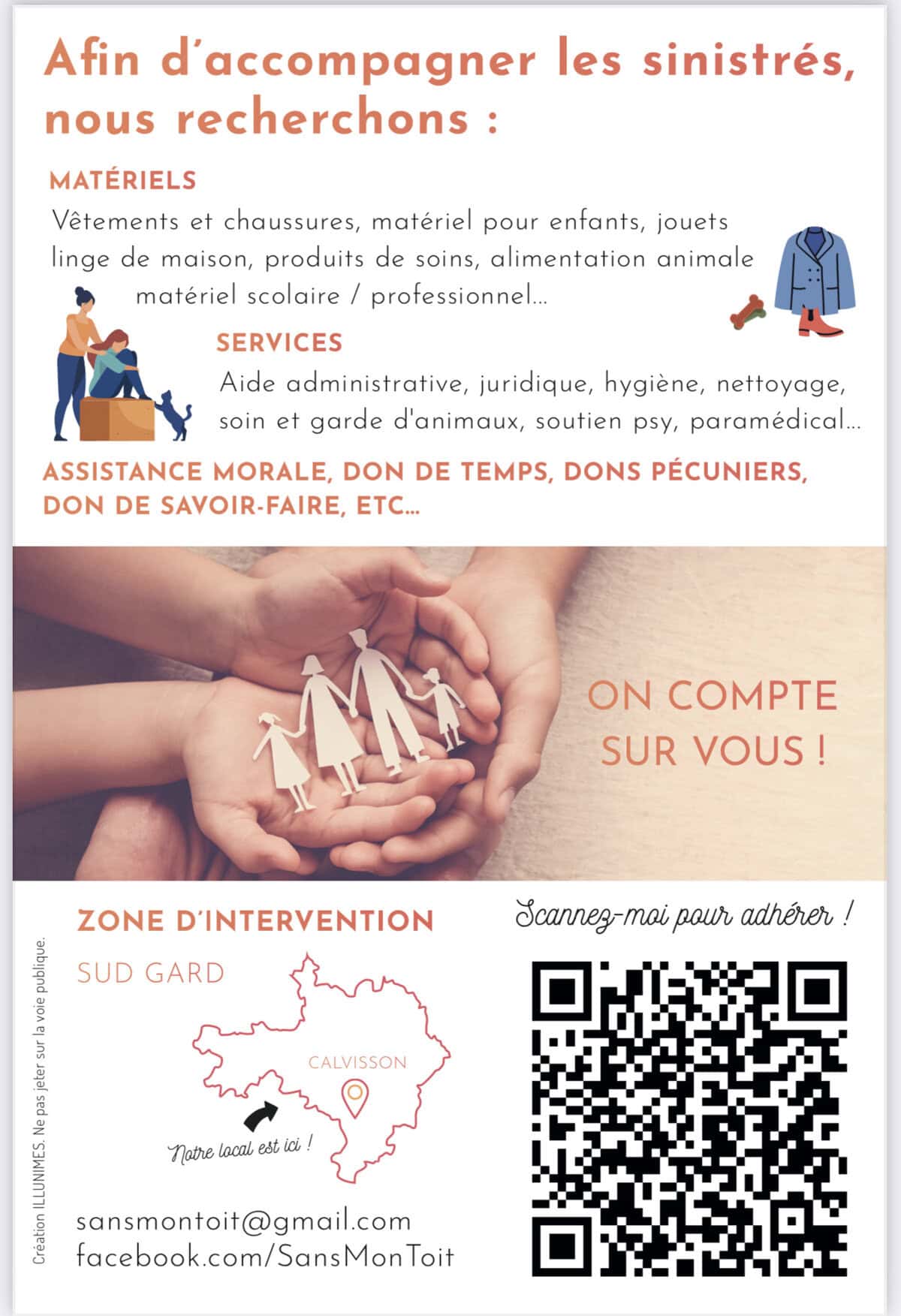 L’association Sans mon Toit est basée dans le Gard. Elle a son siège social sur la commune de Calvisson en Vaunage. L’objectif de l’association est de venir en aide aux sinistrés d’incendie d’habitation. En leur mettant à disposition tout ce qui est de première nécessité en cas de sinistre. Par exemple des vêtements, du matériel scolaire, de l’alimentation animale, du matériel puériculture, etc.