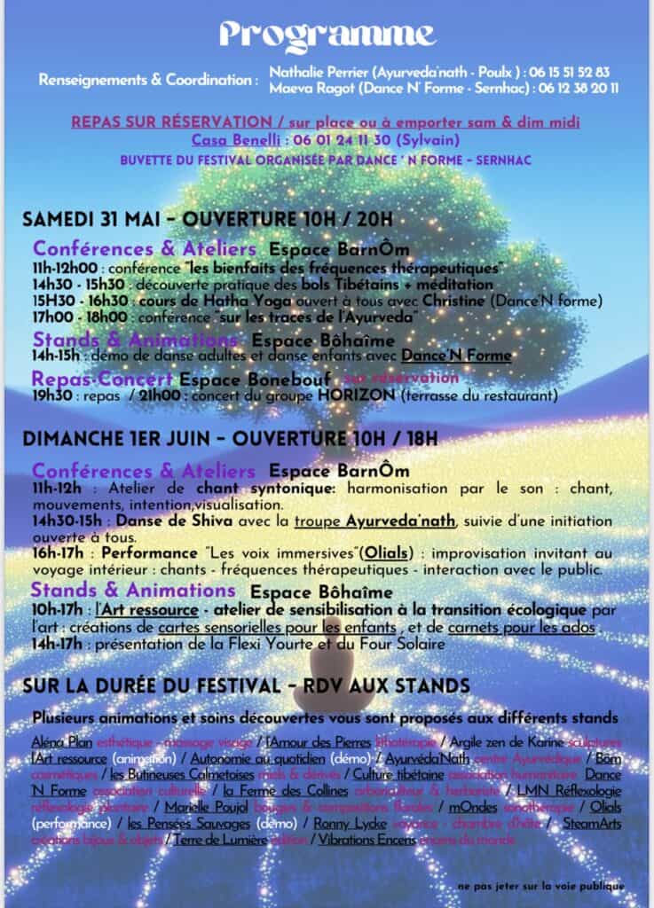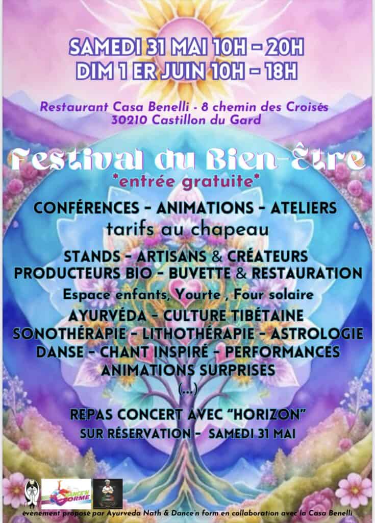 Un week-end dédié au bien-être dans le Gard ! Le Festival du bien-être se déroule ces samedi 31 mai et dimanche 1er juin 2025. L’évènement a lieu au Restaurant Casa Benelli, à Castillon du Gard. Au programme, des conférences, ateliers, animations, etc. Des stands avec artisans et créateurs, producteurs bio. Un repas concert aura lieu le samedi soir ! Découvrez la programmation complète du Festival du bien-être ci-dessous.