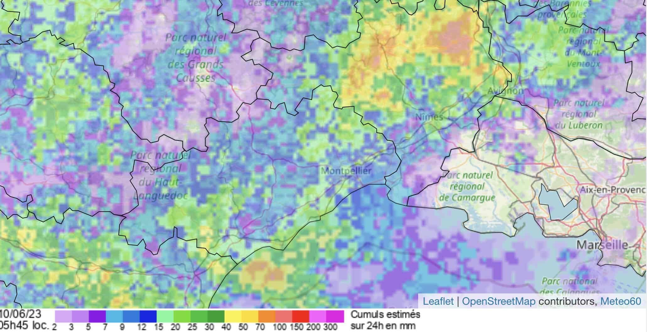 Les relevés font état de cumuls de pluie allant de 150 à 170 mm dans certains secteurs. Les communes de Saint-André-d’Olérargues, Saint-Marcel-de-Careiret, Verfeuil et Sabran, dans le Gard, ont été les plus touchées. Des précipitations intenses en seulement quelques se sont abattues sur ce secteur.