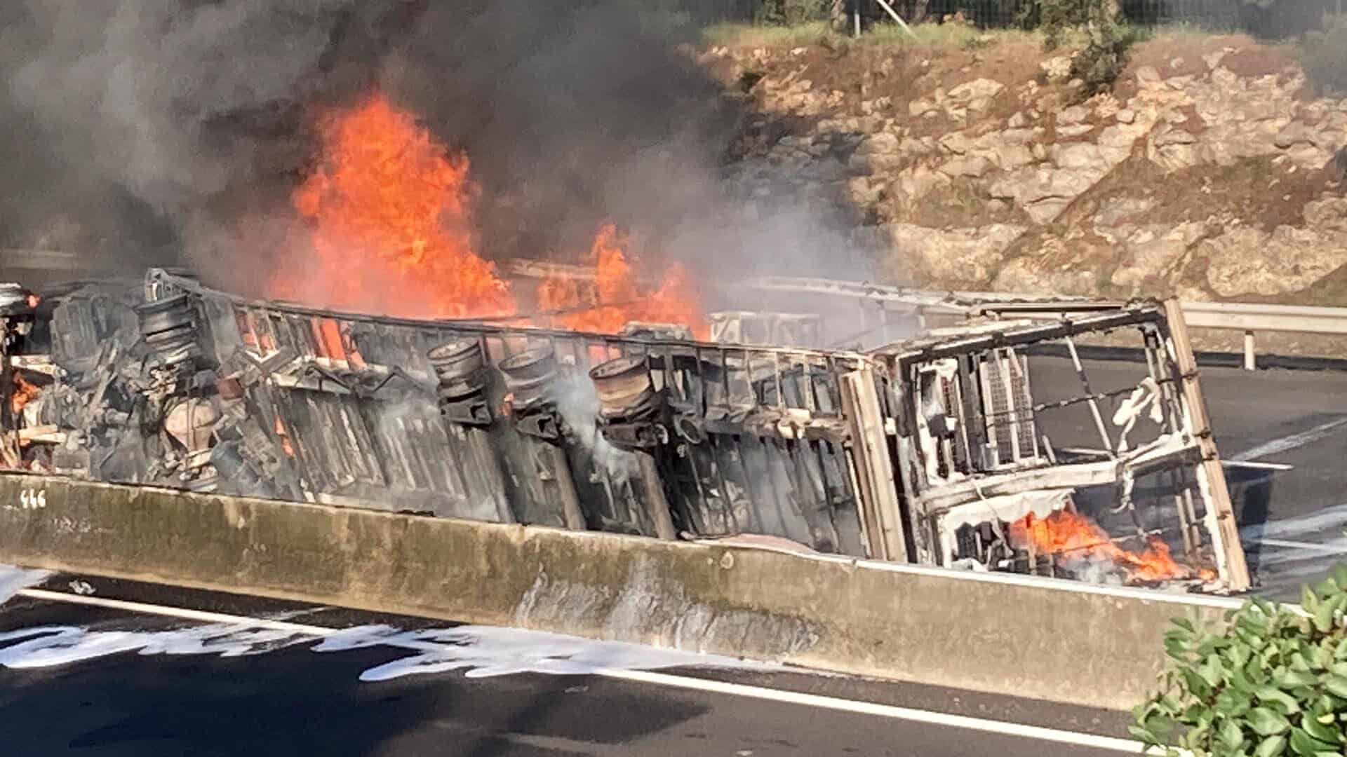 Poids-lourd détruit par les flammes sur l’A9 – Photo Cedric Défossez pour InfOccitanie