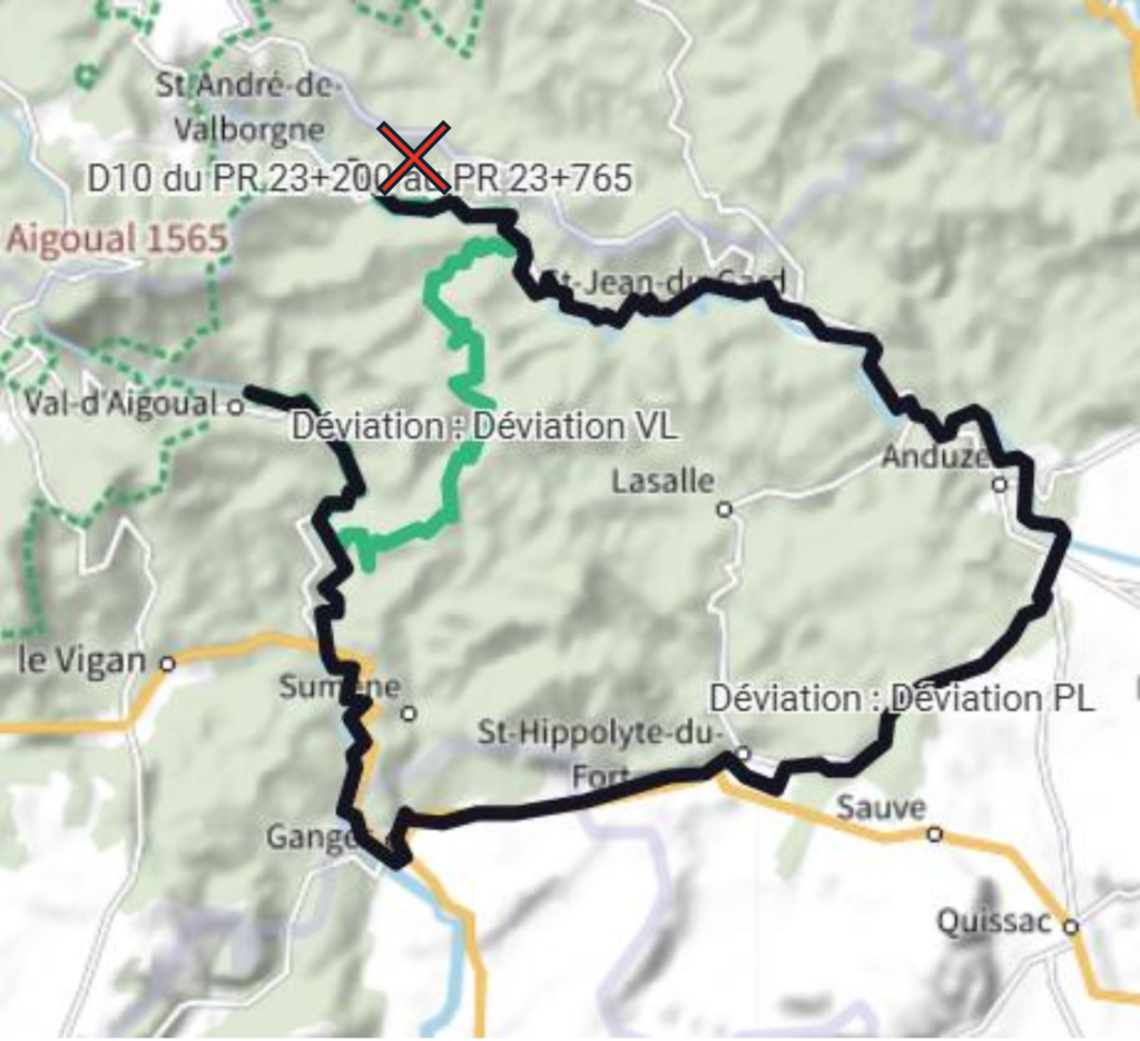 Afin d’assurer la continuité des déplacements, deux itinéraires de déviation sont mis en place pour rejoindre Valleraugue depuis Saint-André-de-Valborgne :