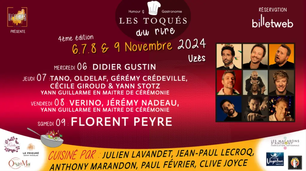 Tous les soirs, ouverture des portes à 19h, planche de mises en bouche préparée par les chefs (Anthony Marandon, Julien Lavandet, Clive Joyce, Jean-Paul Lecroq et Paul Février) et verre de vin de l’AOP Duché d’Uzès (ou jus de fruits artisanal) compris dans le billet. Début du spectacle : 20h30. Réservations ici. Les Toqués du Rire, 11 place Croix des Palmiers, Uzès.