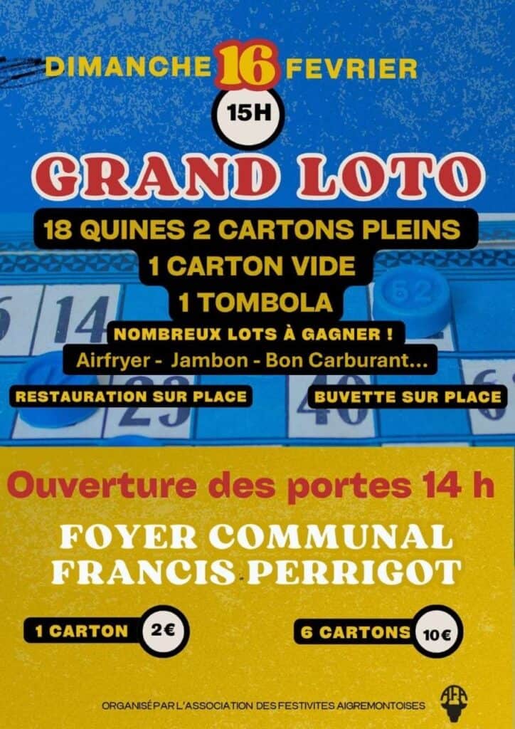 L’association des festivités aigremontoises organise un grand loto ce dimanche 16 février 2025 à 15h00. Le loto aura lieu au foyer communal Francis PERRIGOT. Le loto se compose de 18 quines, de 2 cartons pleins, d’un carton vide et d’une tombola. Nombreux lots à gagner dont Airfryer, jambon, bon carburant, etc… Restauration et buvette sur place. Ci-dessous, toutes les infos.