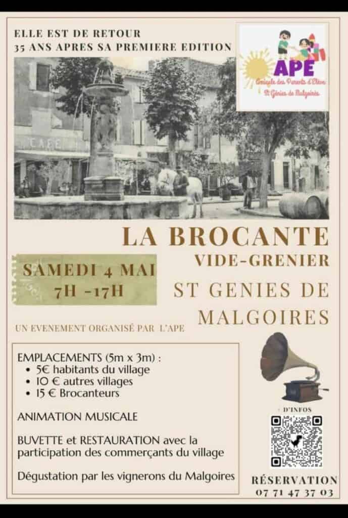 Le village de Saint-Geniès-de-Malgoirès dans le Gard retrouve sa traditionnelle brocante du premier samedi du mois de mai, ce week-end ! Elle aura lieu le samedi 4 mai 2024. Un retour de l’événement après plusieurs années d’interruption. Un réel plaisir pour les habitants du village puisque la traditionnelle brocante/vide grenier a connu sa première édition il y a 35 ans !