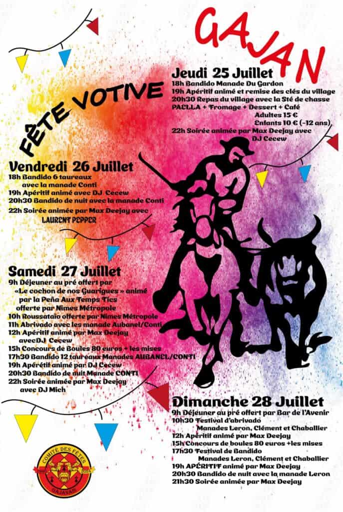 La fête à Gajan dans le Gard, c’est dès demain ! La première journée de fête votive débute ce jeudi 25 juillet 2024 et perdure jusqu’au dimanche 28 juillet. Les Gajanais vous attendent nombreuses et nombreux. En prime, pour une fois, il fera beau ! Du beau temps et de fortes chaleurs pour l’ensemble de la fête votive de Gajan édition 2024. Au programme par exemple, de nombreuses manifestations taurines, des apéros, des concours de boules et des soirées animées par les DJ’s Max, Cecew, Mich et Laurent Pepper. On vous laisse apprécier le programme complet ci-dessous.