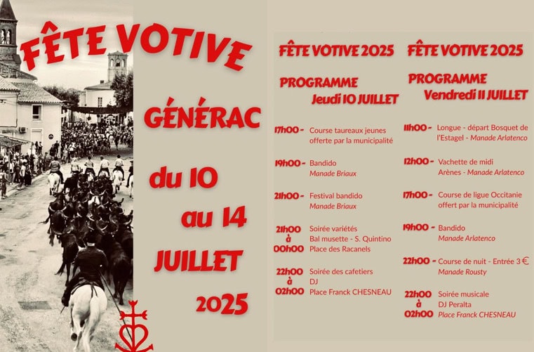 Taureaux, apéros, fanfares et soirées jusqu’au bout de la nuit… À Générac, la fête votive revient du 10 au 14 juillet. Quatre jours de traditions, de musiques et de moments partagés, entre abrivados, bandidos et bals populaires. L’été bat son plein, et Générac fait vibrer le cœur du village.