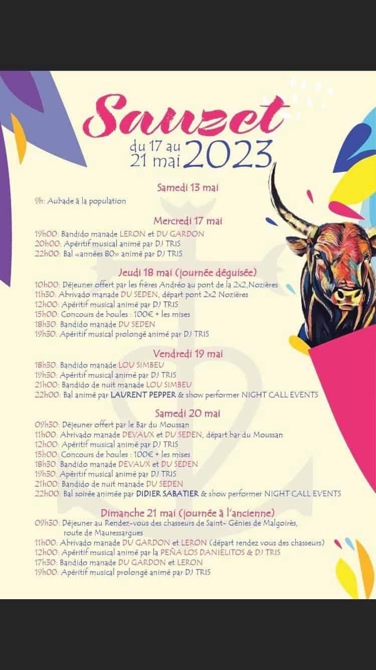 L’équipe du comité des fêtes a préparé un programme très riche pour ces 5 journées de fête au total. Nombreuses manifestations taurines dont des abrivados longues sur parcours ouvert, concours de boules et grosses soirées festives. On notera notamment la présence de l’incontournable DJ Didier Sabatier – Le Daron, pour animer la soirée du samedi 20 mai.