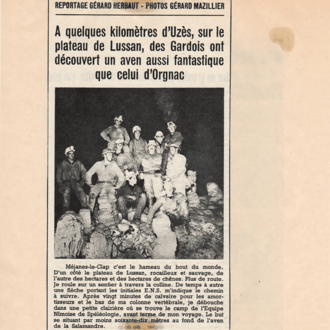 Il y a plus d’un demi-siècle, en 1965, l’Aven de la Salamandre, porte naturelle de la Grotte, a été explorée pour la première fois par une équipe de spéléologues venant d’Uzès et de Nîmes. Après une descente audacieuse de 50 mètres, ils ont découvert un vaste espace semblable à un terrain de football. Ils passent huit jours à explorer la cavité, en compagnie de reporters de l’ORTF. La presse relaie l’information durant toute l’exploration.