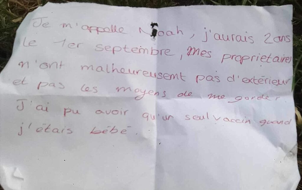 Un chien prénommé Noa, âgé de deux ans, a été attaché du côté de la Spa de Nîmes. « Mais à notre arrivée, pas de chien ! Juste deux gamelles, un jouet et un mot… », déclare la SPA de Nîmes. Les équipes pensent qu’il a réussi à se détacher entre temps. « Nous sommes inquiets pour lui ! S’il vous plaît, propriétaires ou connaissances, dites-nous à quoi il ressemble », appellent les membres de l’équipe. Contactez la SPA de Nîmes, cliquez ici. Le mot laissé à découvrir ci-dessous :