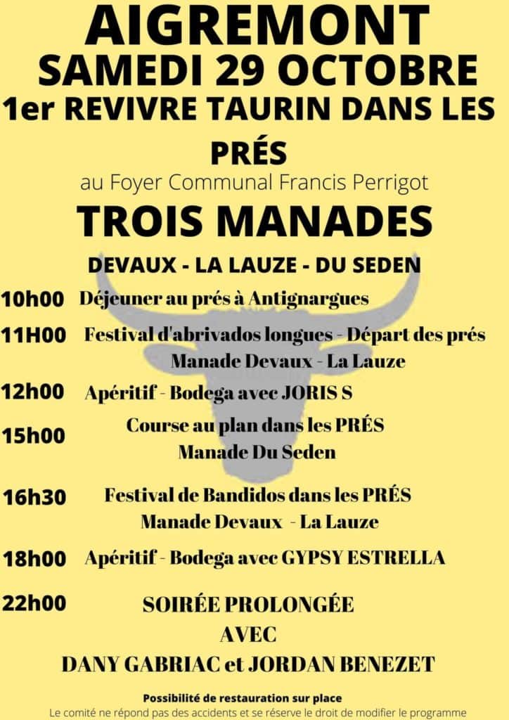 Les amateurs de bouvine vont être servis. Le 1er Revivre de la fête votive d’Aigremont a lieu ce week-end dans le Gard. Le Comité des Fêtes organise une journée complète avec un programme bien chargé. C’est ce samedi 29 octobre 2022 que les fêtards gardois vont se réunir. Cette première édition aura lieu au Foyer Francis Perrigot. Trois manades seront présentes : Devaux, Du Seden et De La Lauze. Rendez-vous dès 10h00 pour le déjeuner au près d’Antignargues. Le festival d’abrivados débutera à 11h00 avec un départ depuis les près d’Antignargues.
