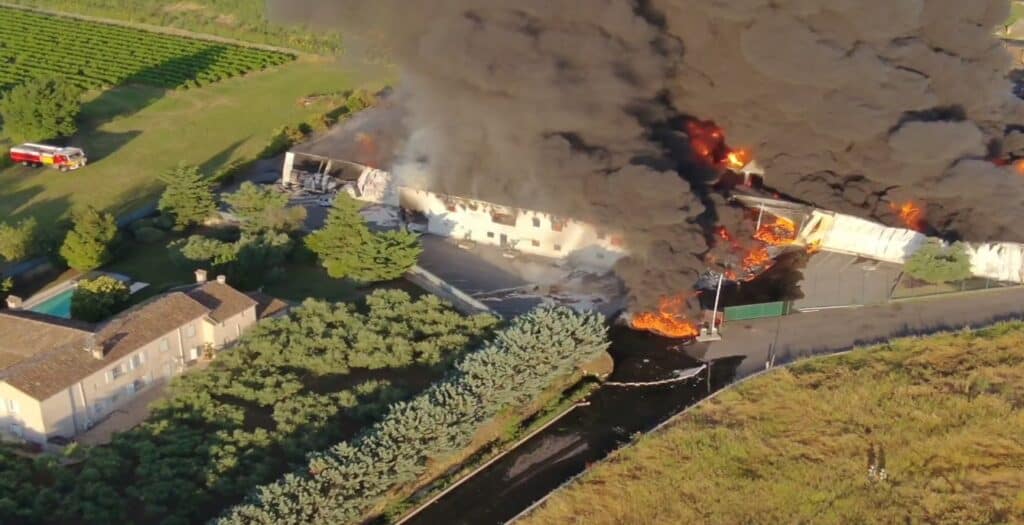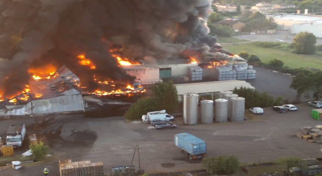 de Saint Christol Les Alès dans le Gard. Le bâtiment est totalement détruit, le feu est toujours virulent avec un fort dégagement de fumées. Un camp de gens du voyage et les habitations situées à proximité immédiates (30 personnes environ au total) ont été évacués par précaution. Il est demandé aux résidants de la commune situés sous le panache de fumée de se confiner dans leur logement afin d’éviter d’inhaler de la fumée.