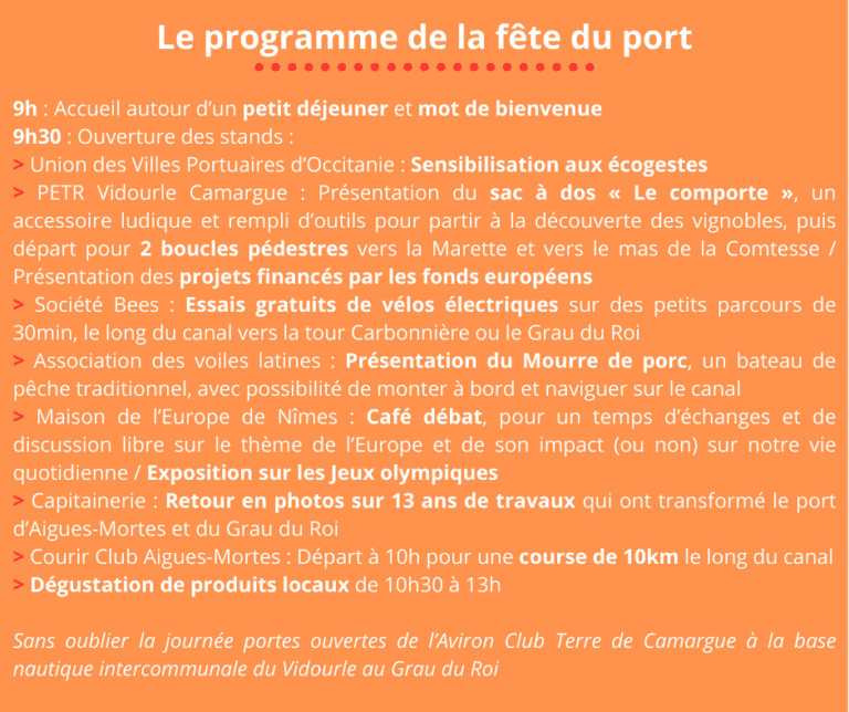 Il lance ainsi sa saison estivale sur un mode joyeux et convivial. Le rendez-vous est donné à 9h, quai des croisades à Aigues-Mortes, face à la capitainerie. Niché au cœur du Grand Site de France de la Camargue gardoise, le port maritime est particulièrement apprécié des plaisanciers. Ils sont près de 5000 à y faire escale chaque année.