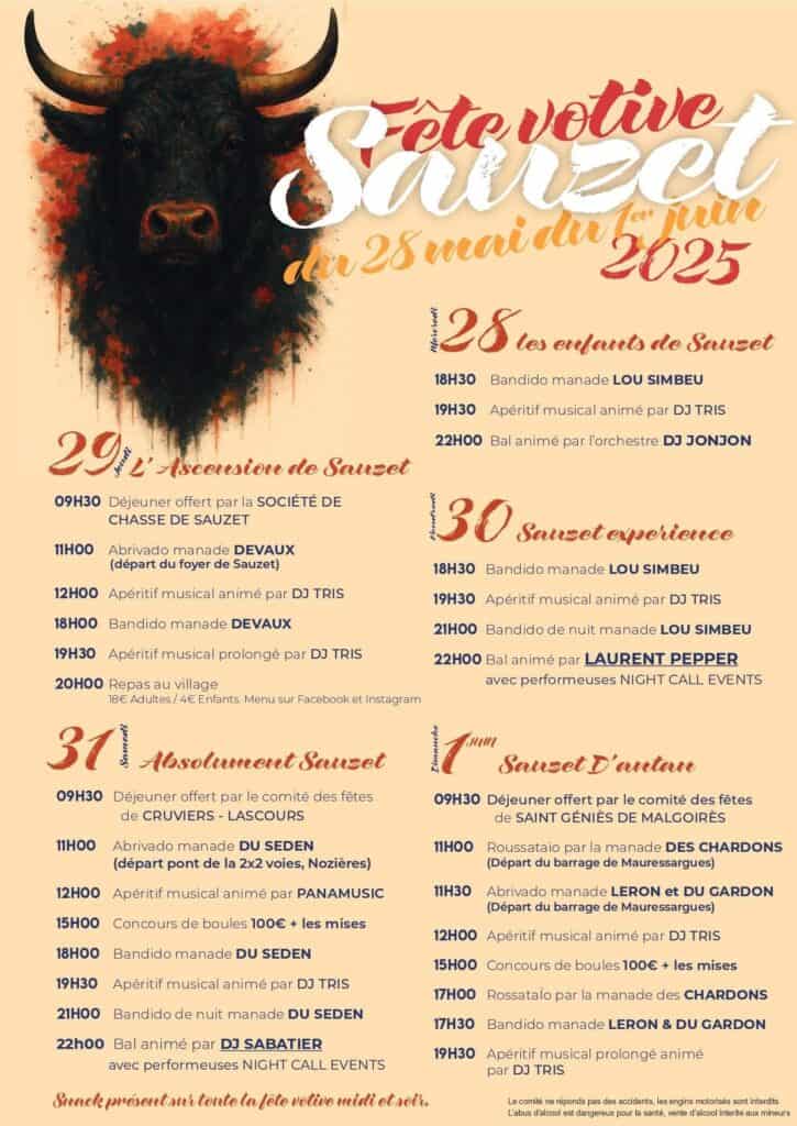 La fête votive de Sauzet dans le Gard approche. Ce charmant petit village gardois, au cœur de la Gardonnenque, organise chaque année plusieurs jours de fête, grâce au Comité des Fêtes géré par un groupe de jeunes surmotivés. La fête débute ce mercredi 28 mai et dure jusqu’au dimanche 1er juin. Au programme, de nombreuses manifestations taurines, des concours de boules, des soirées avec des DJ de renom, etc. Chaque journée aura sa thématique, comme détaillé dans le programme officiel ci-dessous.