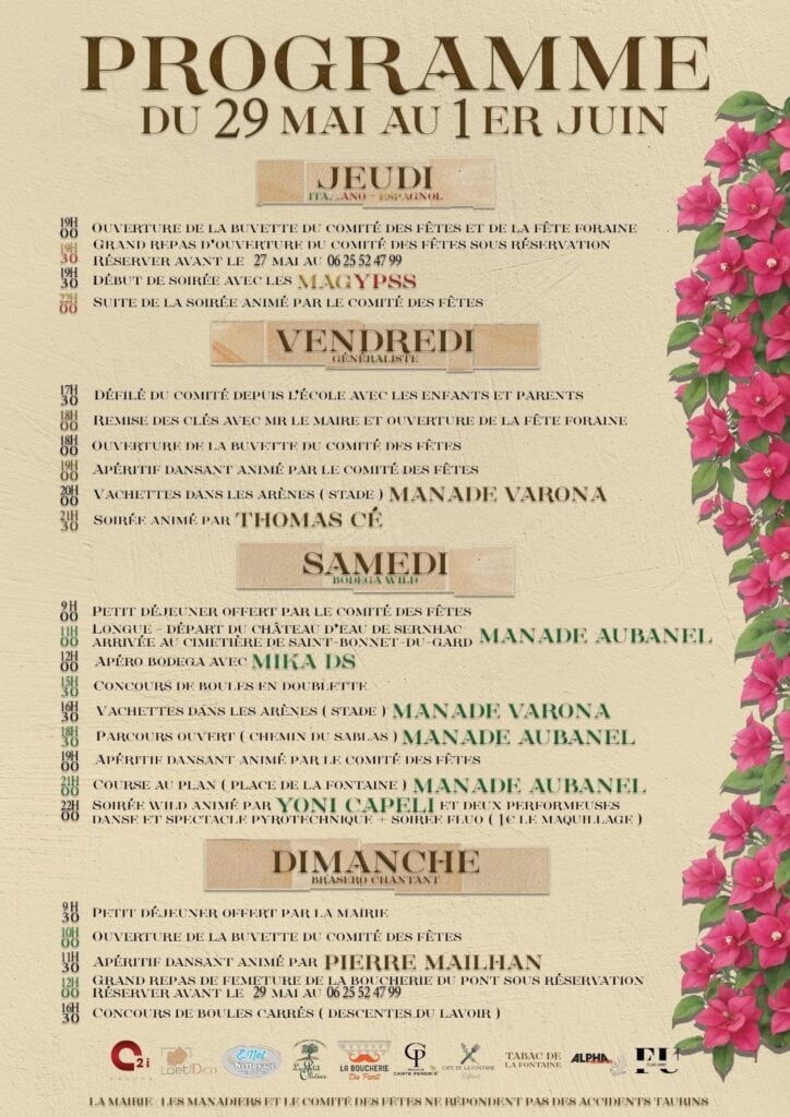 Abrivado longue, vachettes dans les arènes, spectacle pyrotechnique, soirée fluo, animations musicales entre autres : Saint-Bonnet-du-Gard (non loin de Remoulins dans le Gard) a mis le paquet. Attention, le repas du jeudi 29 mai est annulé en raison d’un manque de réservations, indique le comité des fêtes de la commune. Contactez le 06 25 52 47 99 pour plus d’informations. Le programme ci-dessous :