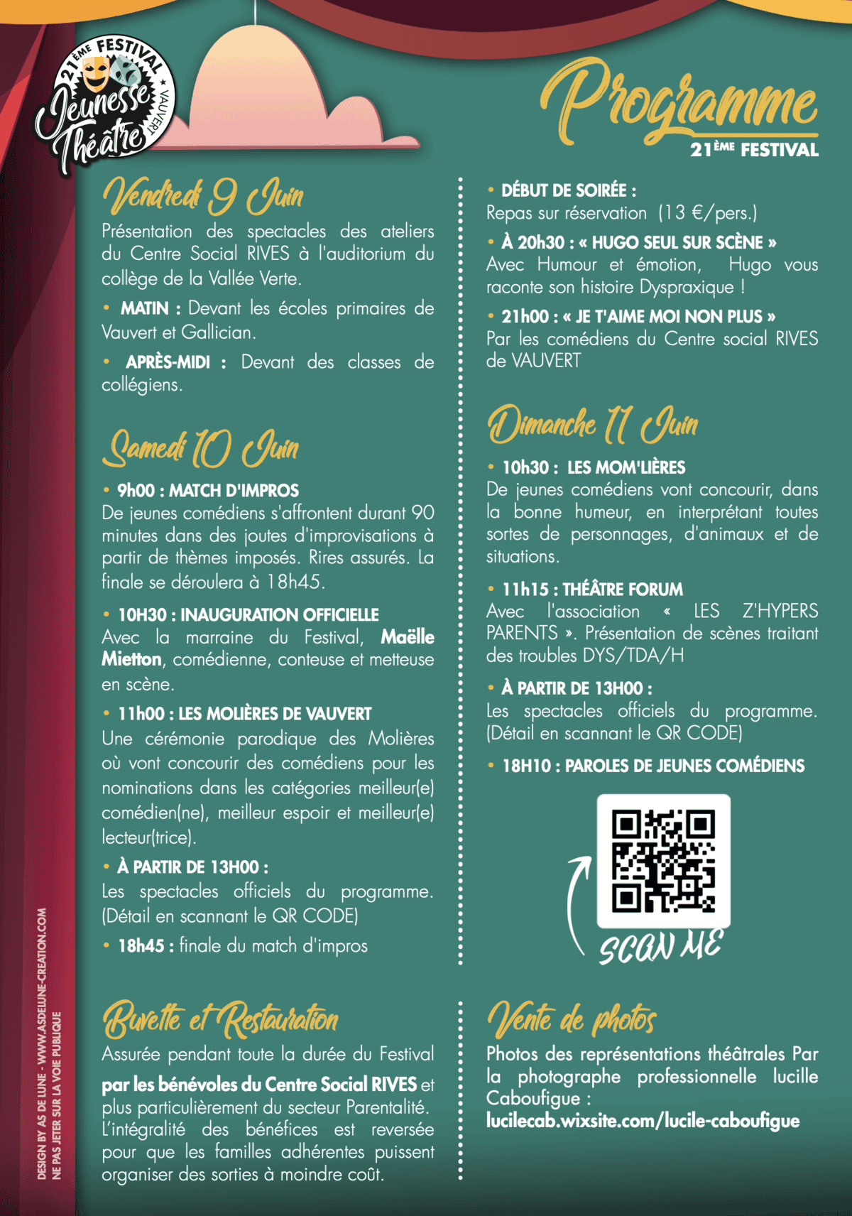 Durant l’intégralité du festival, une buvette va être mise à disposition des spectateurs où tous les bénéfices seront reversés pour que les familles adhérentes puissent partir en vacances. Les tarifs d’accès aux représentations sont de 2€, pour les moins de 18 ans et de 3€ pour les adultes pour le pass d’une journée au choix et de 3€, pour les moins de 18 ans, à 4€ pour les adultes pour profiter des deux journées complètes. Pour plus d’informations sur l’événement rendez-vous ici