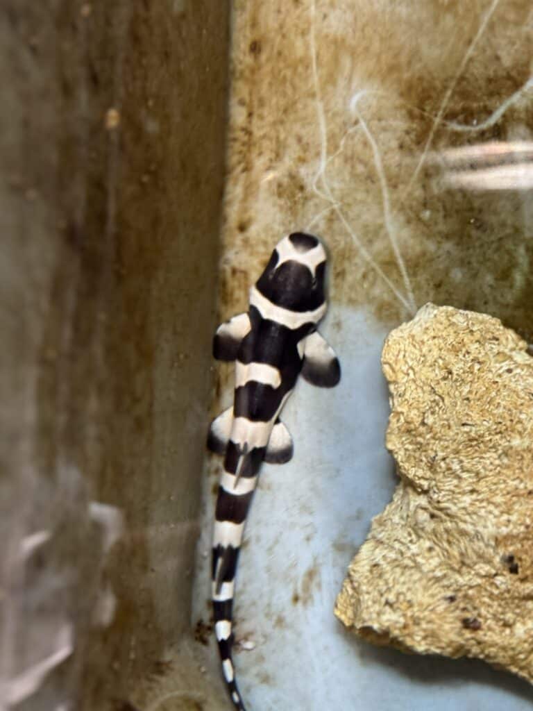 Un petit requin bambou (Chiloscyllium punctatum), noir à bandes blanches, a vu le jour au Seaquarium Institut Marin du Grau du Roi il y a une semaine, après plusieurs mois d’incubation à l’abri des regards des soigneurs.