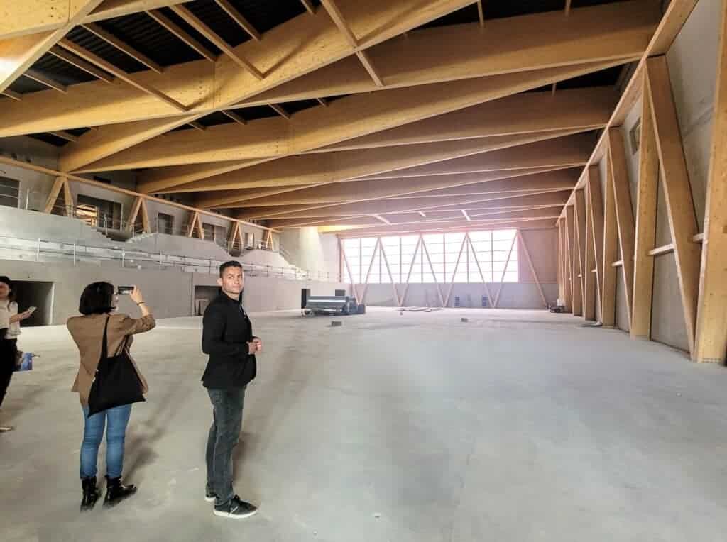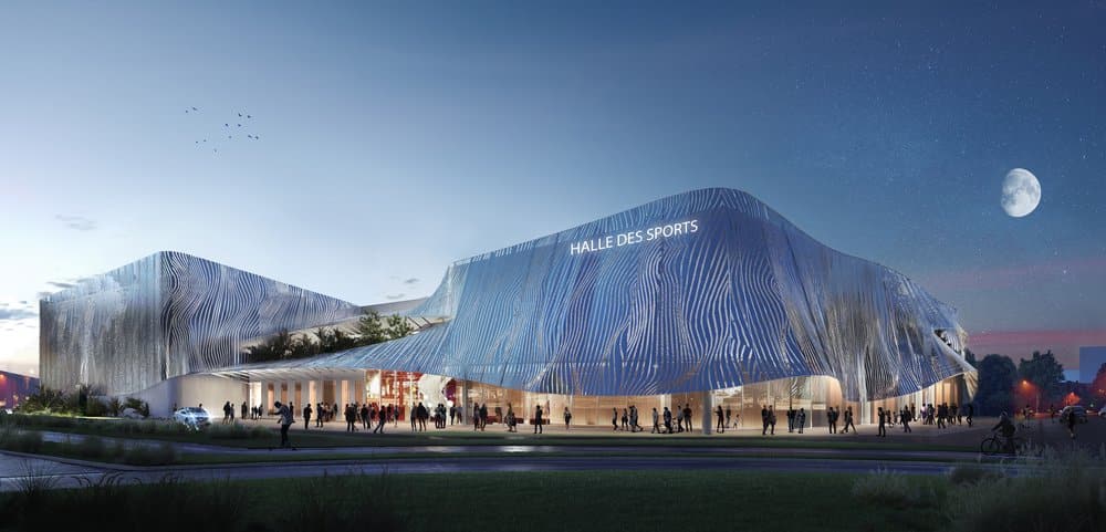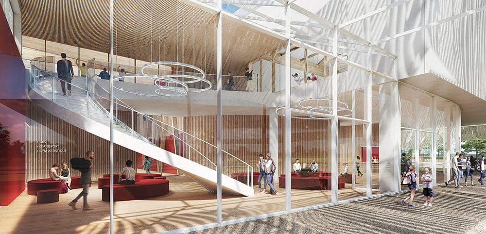 Un vaste hall d’accueil permet d’accéder à une salle polyvalente de 1000 m², pouvant accueillir expositions et manifestations. À ses côtés, une salle omnisport se déploie sur deux étages avec un accueil gradins. L’éventail de pratiques sportives est large : volley, handball, futsal, badminton, basket, handisport ou encore escalade. Ce sont 5 salles spacieuses dédiées au sport, avec pour chacune un vestiaire et espace de rangement dédié. Deux salles de gymnastique (artistique ; rythmique et sportive) complètent les installations du rez-de-chaussée. L’étage, accessible par un escalier en hélice et un ascenseur, distribue une salle d’armes et une salle de combat. A noter, la salle d’escrime comporte 14 pistes. Au total, 11 disciplines sportives seront accueillies.