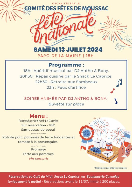 Traditionnelle soirée républicaine, sous la halle, place du marché. Pour les gourmands, les restaurants du village (le bar du marché, la cuisine du boucher, le restaurant des potiers) proposeront des menus à déguster sur place, le glacier l’Envie se chargera des desserts.