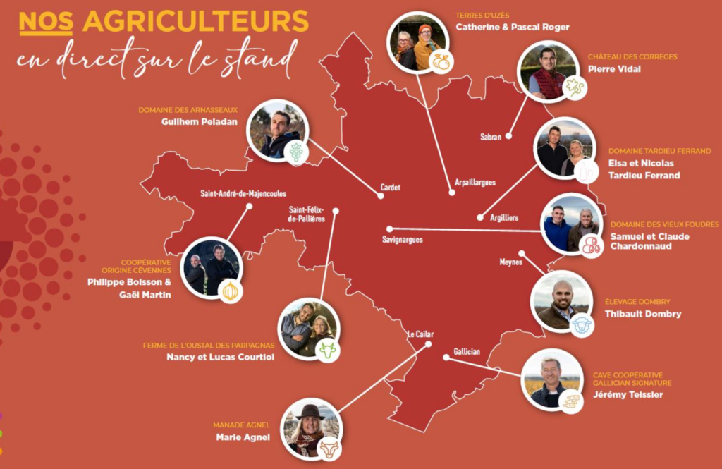 Le stand du Conseil départemental du Gard restera pour autant une vitrine dédiée à la promotion, à la dégustation et à la vente de produits. Il permet au département de valoriser le savoir-faire des femmes et des hommes ainsi que la diversité de son patrimoine matériel et immatériel afin de développer son attractivité. Découvrez la carte ci-dessous répertoriant les agriculteurs gardois qui seront présents sur le stand :
