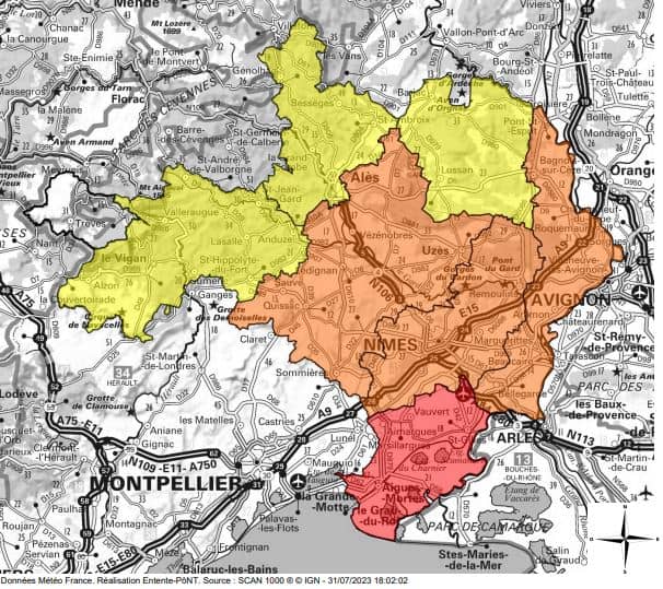 Trois zones sont quant à elles placées en risque élevé d’incendie de forêt, il s’agit : des Garrigues, du Gard Rhodanien et du Gardon-Vidourle. Les promenades et randonnées, ainsi que les travaux professionnels sont fortement déconseillés dans ces zones. Le reste du département est en vigilance modéré.