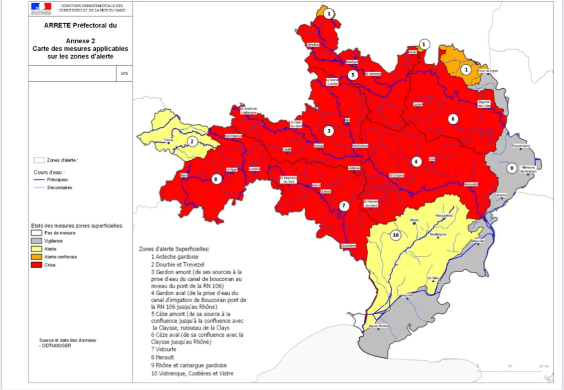 Dans ce contexte, Marie-Françoise Lecaillon, Préfète du Gard, a pris la décision de classer de nombreuses zones du département du Gard en « situation de crise ».