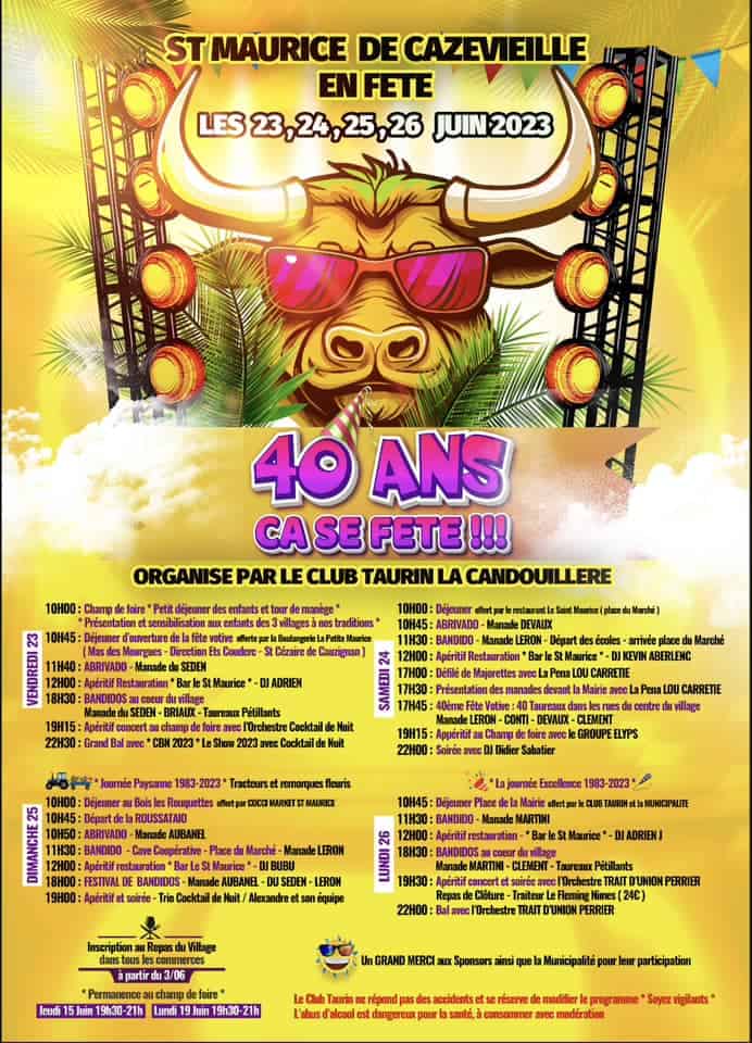La fête votive de Saint-Maurice-de-Cazevieille dans le Gard fête ses 40 ans cette année ! Pour l’occasion, le Club Taurin La Candouillère a préparé un programme exceptionnel. La fête se déroulera sur 4 journées, du 23 au 26 juin. Au programme, de nombreuses manifestations taurines avec notamment 40 taureaux le samedi soir.