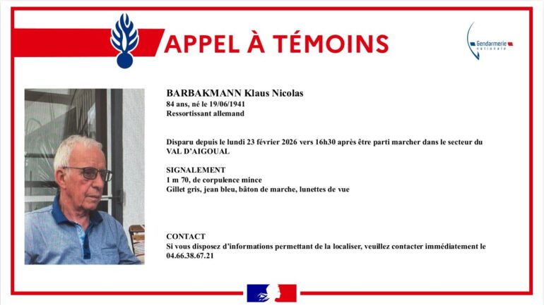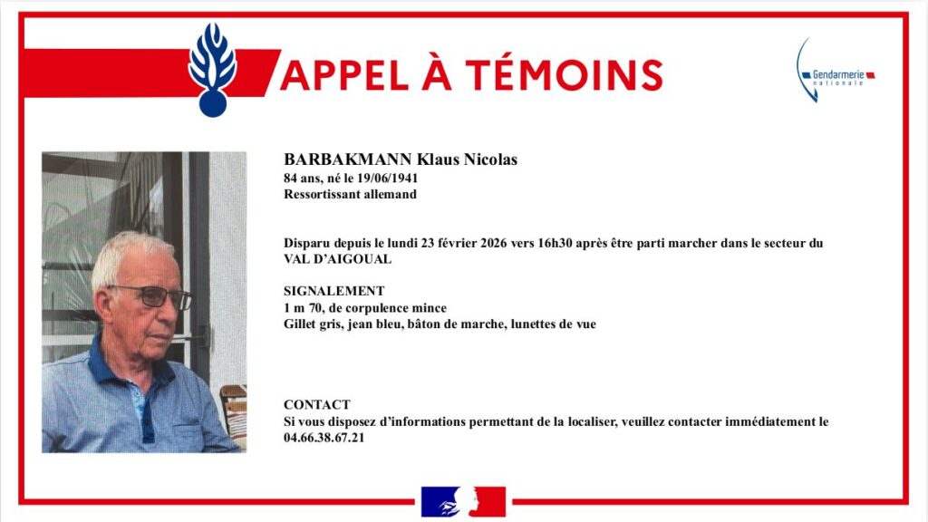 Nicolas Klaus Barbakmann, ressortissant allemand de 84 ans, est porté disparu depuis le 23 février 2026 après être parti marché dans le secteur du Val d’Aigoual.