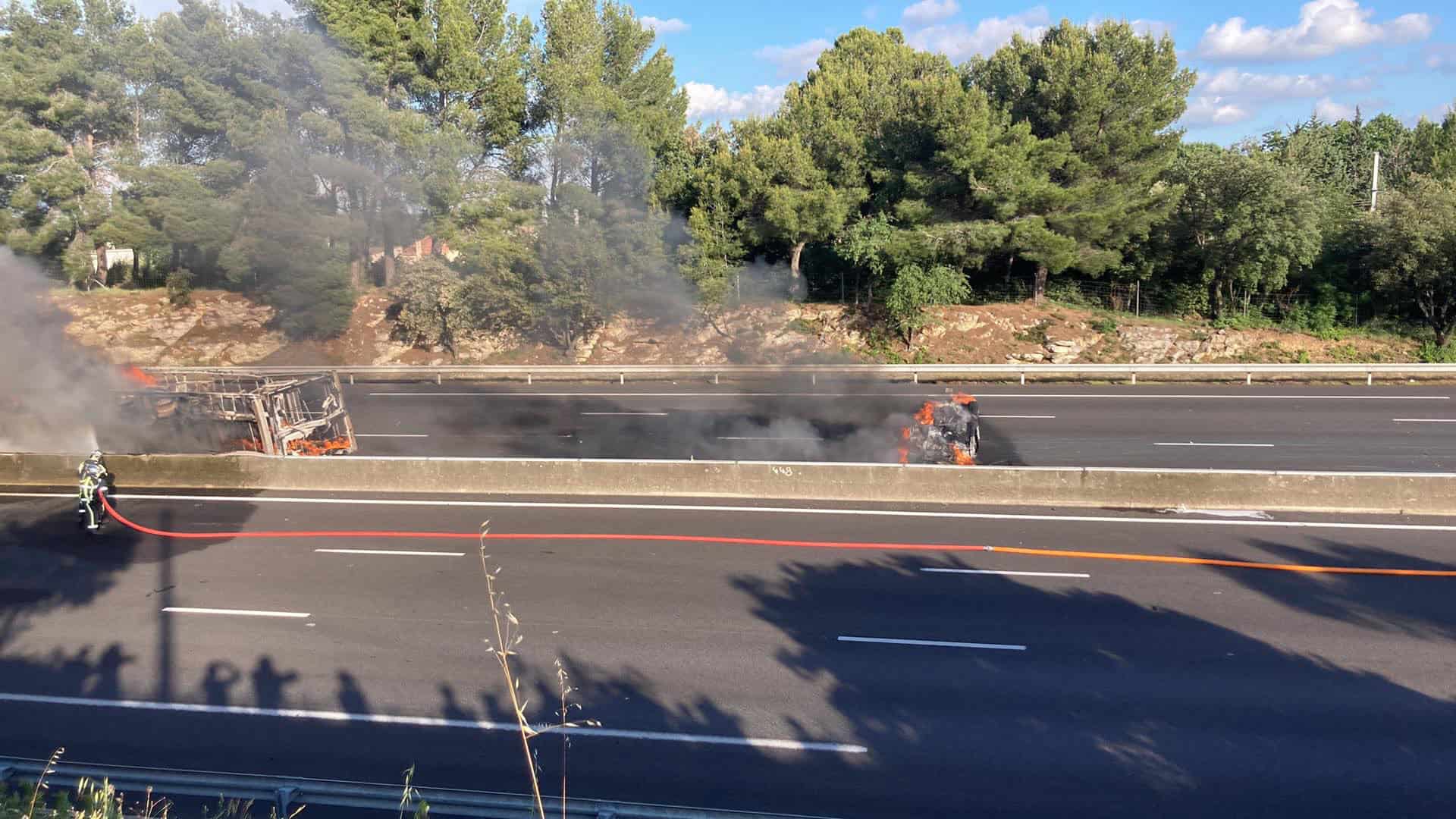 Gard : deux véhicules en feu sur l’A9, l’autoroute coupée dans les deux sens