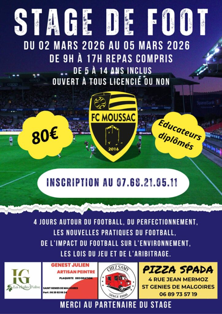 Le stage se déroulera du 02 au 05 mars. Il sera organisé par l’éducateur diplômé Grégory Grauby et se tiendra au FC Moussac. Renseignements et inscriptions : 07 68 21 05 11.