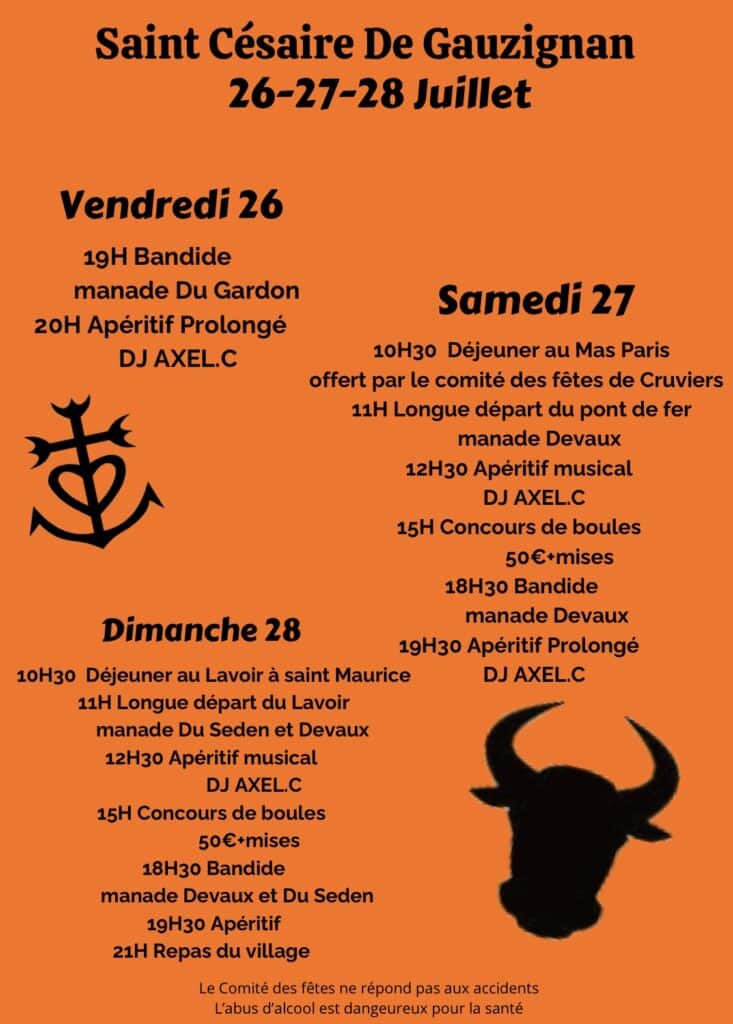 Les fêtes votives s’enchaînent les unes après les autres dans le Gard. Ce week-end, c’est au tour de Saint-Césaire-de-Gauzigan, petit village paisible dans l’intérieur du Gard, d’être en fête ! La fête votive débute ce vendredi 26 juillet 2024. Cette année, elle se déroule sur trois jours, jusqu’au dimanche 28 juillet ! Au programme par exemple, deux abrivados longues, ce qui se fait plutôt rare maintenant dans nos villages. En prime, grand beau temps et fortes chaleurs pour en profiter. Bandidos, apéritifs prolongés et concours de boules au menu du week-end également.