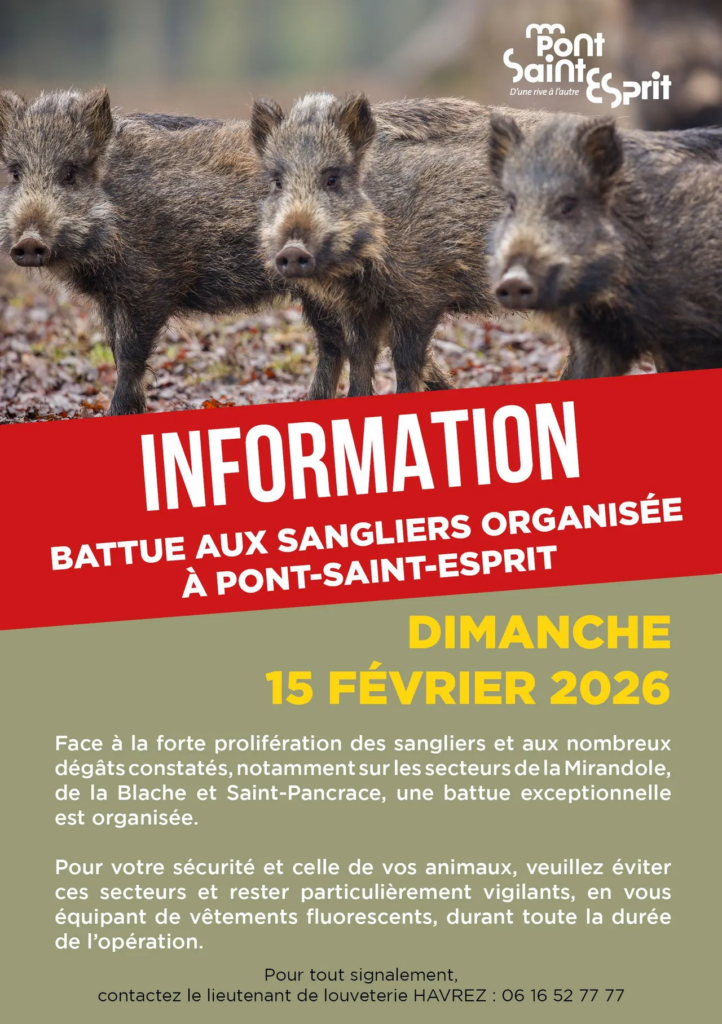 Le dimanche 15 février 2026, la Société de Chasseurs Spiripontains de Pont-Saint-Esprit, dans le Gard, organise une battue de sangliers dans les secteurs de la Mirandole, de la Blache et du Château, à l’ouest de la commune.