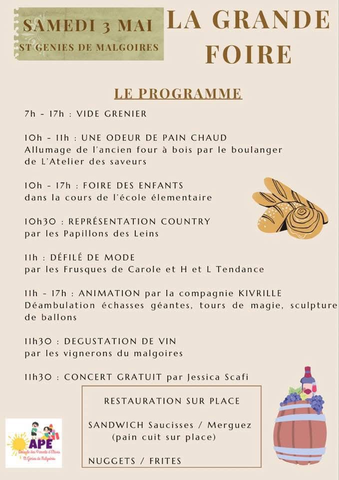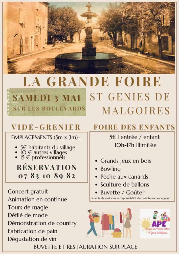 Après le franc succès de la précédente édition, l’Amicale des Parents d’Élèves (APE) relance la brocante – foire – vide grenier de Saint-Geniès-de-Malgoirès dans le Gard pour une seconde édition très attendue. L’événement aura lieu le samedi 3 mai, toute la journée. Plus de 110 stands sont déjà réservés, signe de l’engouement grandissant autour de cet événement. Au programme : une brasucade conviviale, un groupe musical pour l’ambiance, une foire dédiée aux enfants… Une journée festive et familiale en plein cœur du village, sur les boulevards, un cadre que les exposants comme les visiteurs apprécient particulièrement.