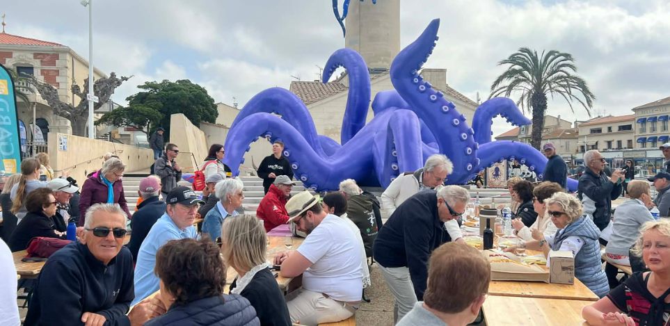 Les Graulinades ont 15 ans. Ce samedi 11 avril, des centaines de gourmands se réunissent au Grau-du-Roi (Gard) pour se délecter de bons produits de la mer et se retrouver autour d’un verre. « C’est avant tout une fête du partage », rappelle au micro Charly Crespe, nouveau maire qui inaugure pour la première fois cet événement phare. Les mines sont ravies, les plateaux d’huîtres passent de main en main aux abords du poulpe bleu géant devenu la mascotte de l’événement. Ça rissole, mijote, crépite sur le feu tout en entraînant un sillage de fragrances iodées. Au programme : des plats cuisinés en public par des habitants du Grau du Roi, des restaurateurs et des pêcheurs, ainsi que par des chefs. Le parking de la Villa Parry incarne aujourd’hui la valorisation du patrimoine de la mer et du moteur économique que constitue la pêche, soumise à bien des réglementations draconiennes en perspective… Soit, le temps est à la fête, véritable pied de nez aux injonctions de quotas et autres règles ubuesques pour la pêche non industrielle qui planent sur les têtes. Retour en photos et vidéos de l’événement ci-dessous :