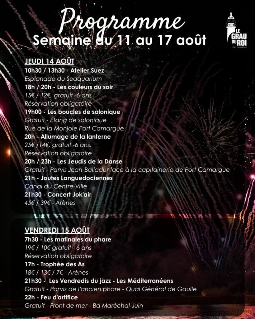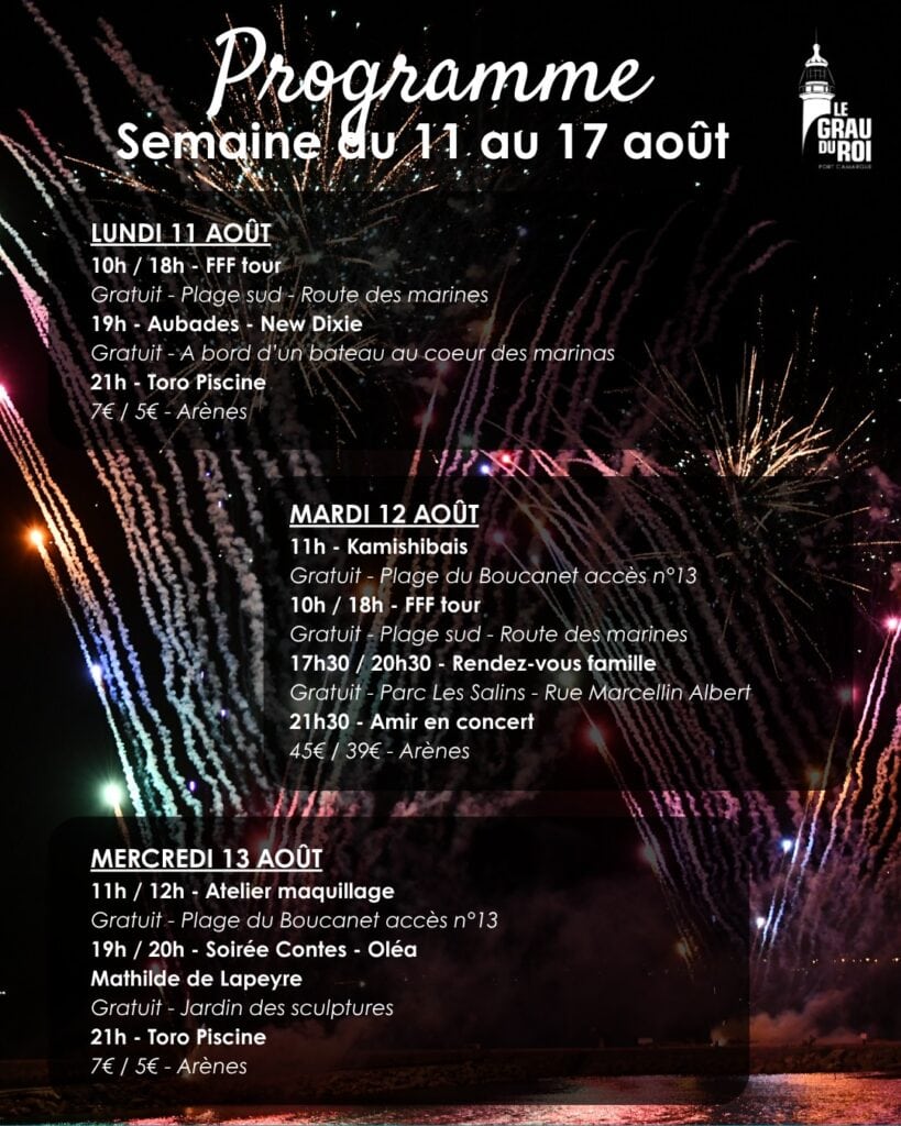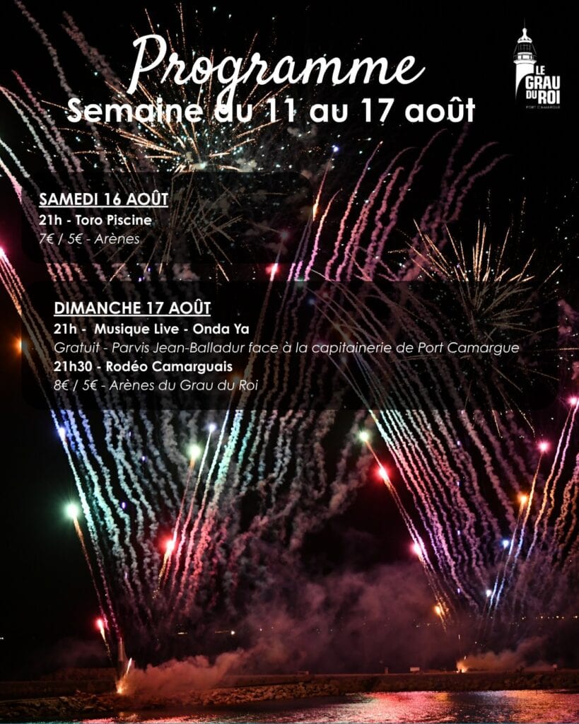 Le programme estival est chargé du 11 au 17 août au Grau du Roi ! Aubade, toro piscine, Trophée des As, concert de Amir, rodéo camarguais ou feu d’artifice le 15 août. Ce dernier sera tiré à 22h sur le front de mer, boulevard Maréchal Juin. Programme complet des festivités ci-dessous en images :